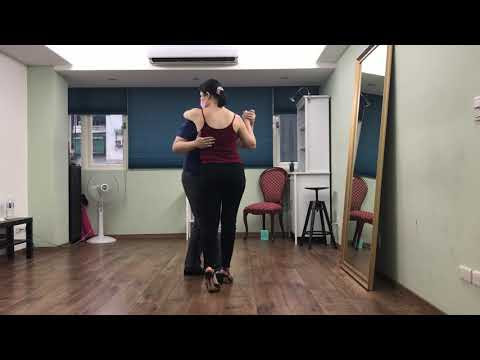 老師先是胸貼胸帶著我作Parada。本來以為照以前的方式隨意刷過腳背即可,沒想到老師慎重地停下來,跟我解說男生的腳外側與腳踝,需要感受女生怎樣的力道。刷,要刷的有感情、有存在的份量;此外,刷完之後在哪個拍點,才落下重心腳於男生的腳內側,也有二個選擇:一種是去感受男生上半身深擁抱裡旋轉的角度/傾度,它會自然帶出女士落腳的時間點。另一個情況是:若男生上半身沒有往落點的方向繼續旋轉,只是帶者女生刷到一半,女生何時將腳背刷出男生的小腿骨,則可由女生決定。